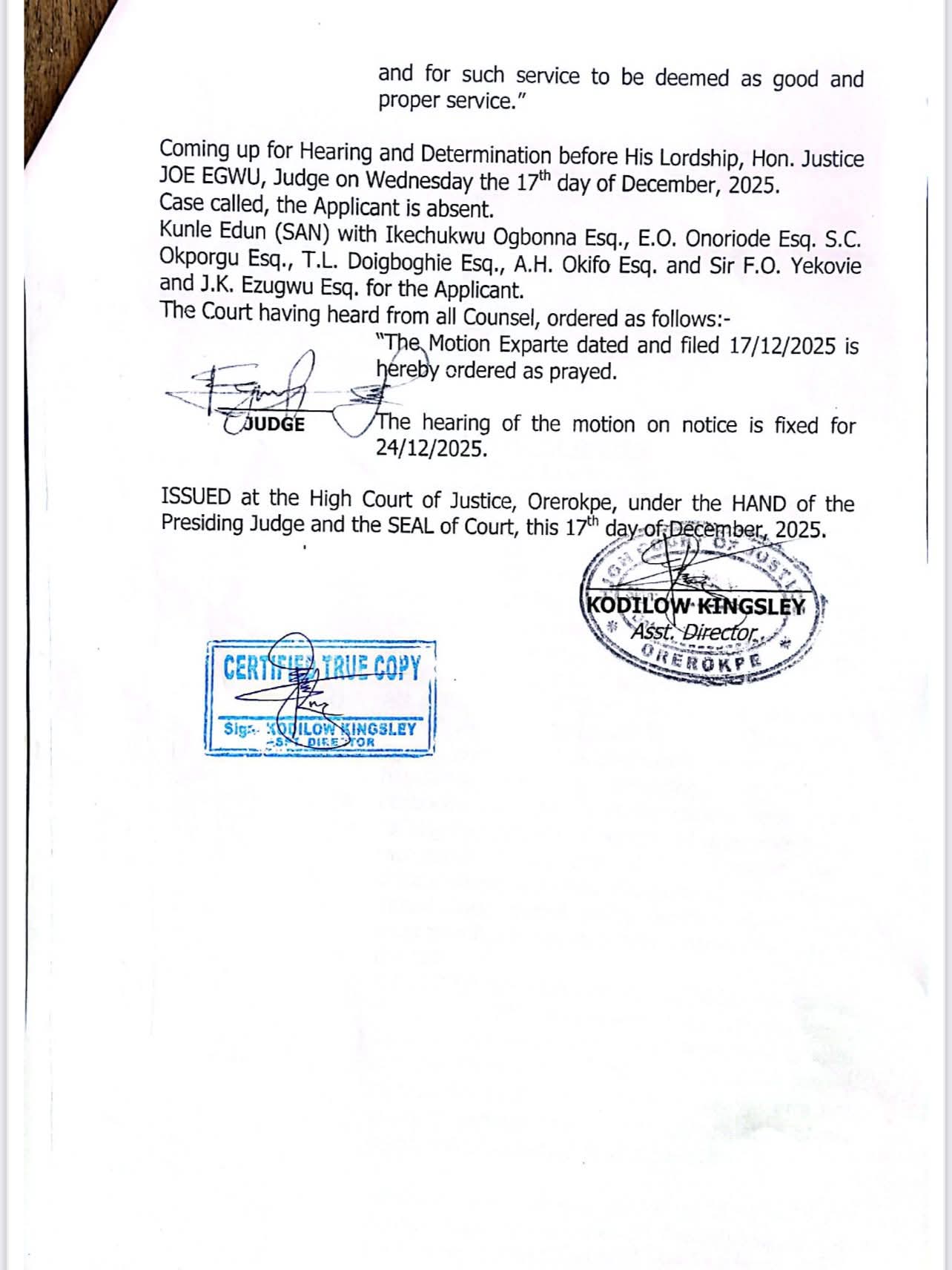 The order was granted on Wednesday, 17th December 2025, by Honourable Justice Joe Egwu, sitting at the High Court of Justice, Orogokpe Judicial Division, Delta State.